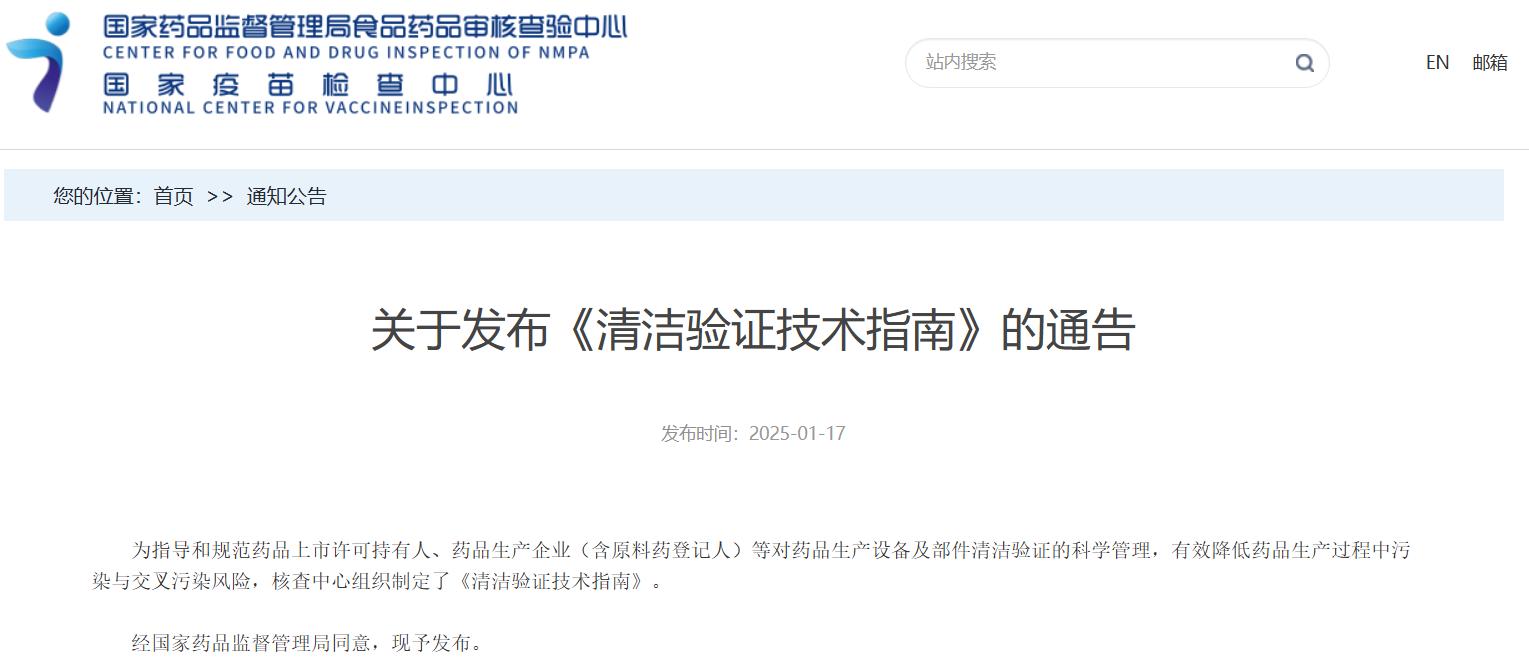 國家藥監(jiān)局核查中心關于發(fā)布《清潔驗證技術指南》的通告
