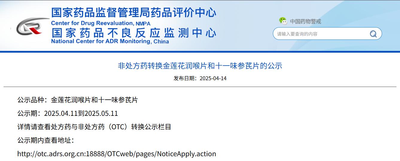 非處方藥轉(zhuǎn)換金蓮花潤喉片和十一味參芪片的公示