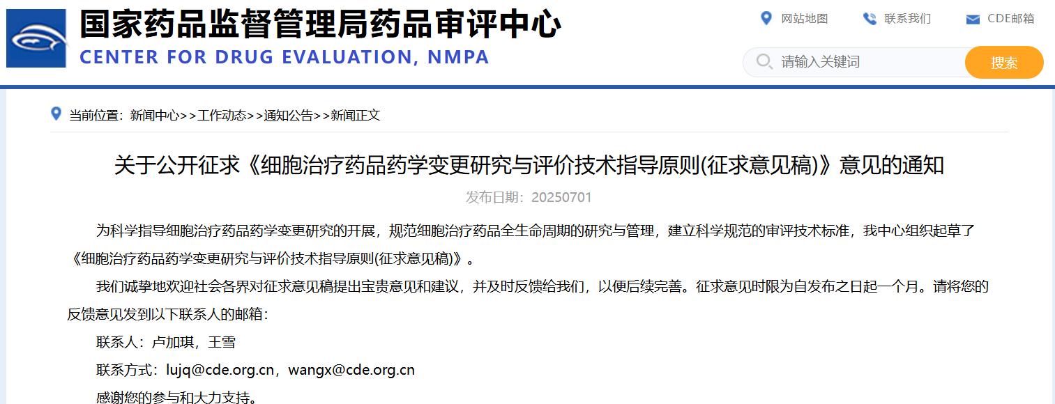 關(guān)于公開征求《細胞治療藥品藥學變更研究與評價技術(shù)指導原則(征求意見稿)》意見的通知