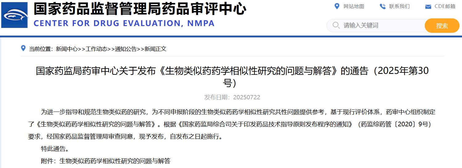 國(guó)家藥監(jiān)局藥審中心關(guān)于發(fā)布《生物類似藥藥學(xué)相似性研究的問(wèn)題與解答》的通告(2025年第30號(hào))