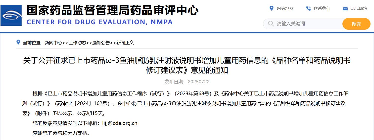 關(guān)于公開(kāi)征求已上市藥品ω-3魚油脂肪乳注射液說(shuō)明書增加兒童用藥信息的《品種名單和藥品說(shuō)明書修訂建議表》意見(jiàn)的通知