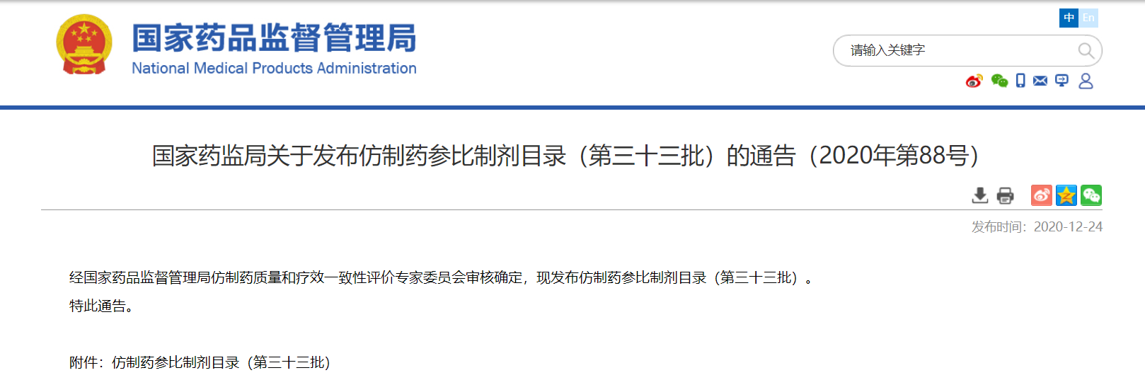 關(guān)于發(fā)布仿制藥參比制劑目錄(第三十三批)的通告(2020年第88號)