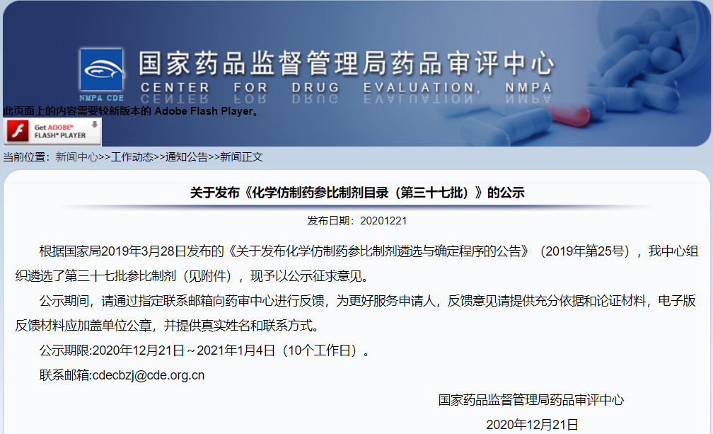 關(guān)于發(fā)布《化學(xué)仿制藥參比制劑目錄(第三十七批)》的公示