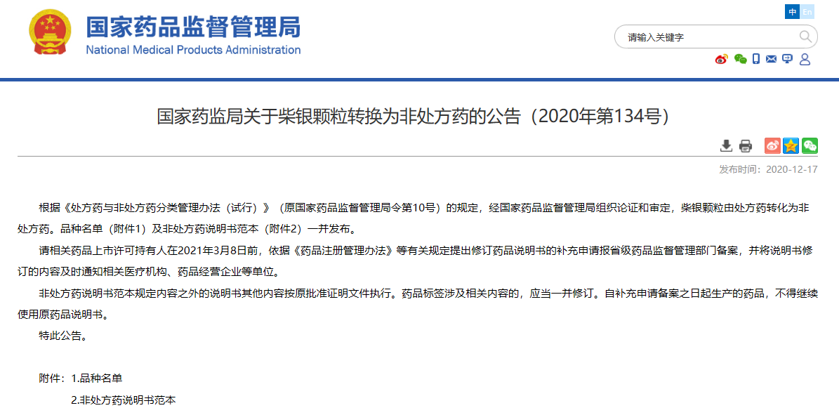 關(guān)于柴銀顆粒轉(zhuǎn)換為非處方藥的公告(2020年第134號)