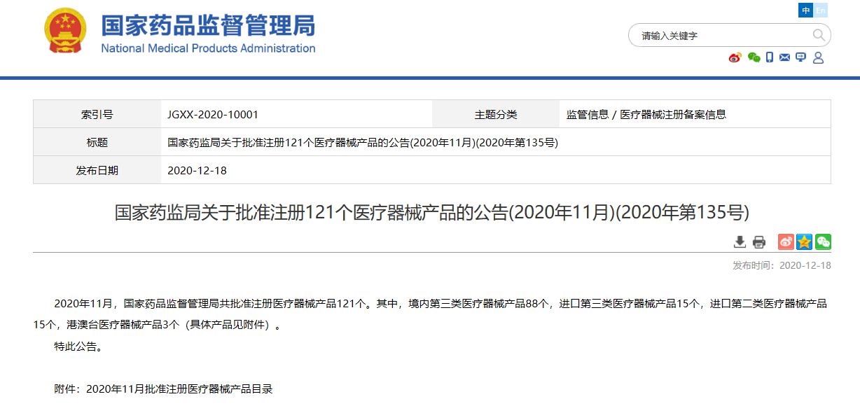 關(guān)于批準注冊121個醫(yī)療器械產(chǎn)品的公告(2020年11月)(2020年第135號)