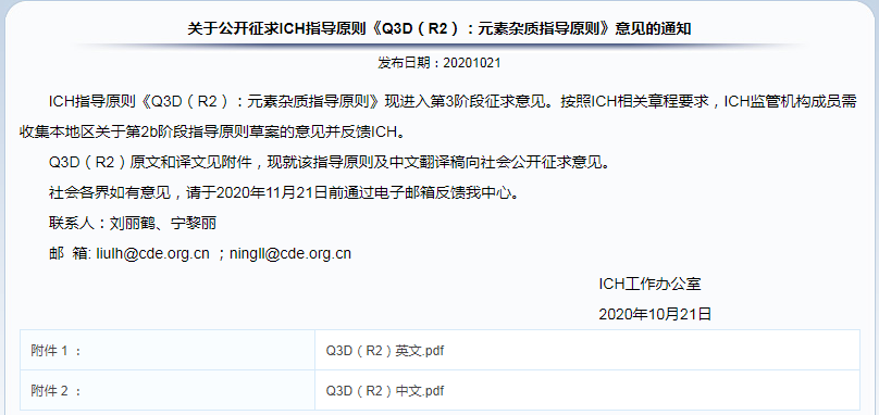 ? 關(guān)于公開征求ICH指導(dǎo)原則《Q3D(R2):元素雜質(zhì)指導(dǎo)原則》意見的通知