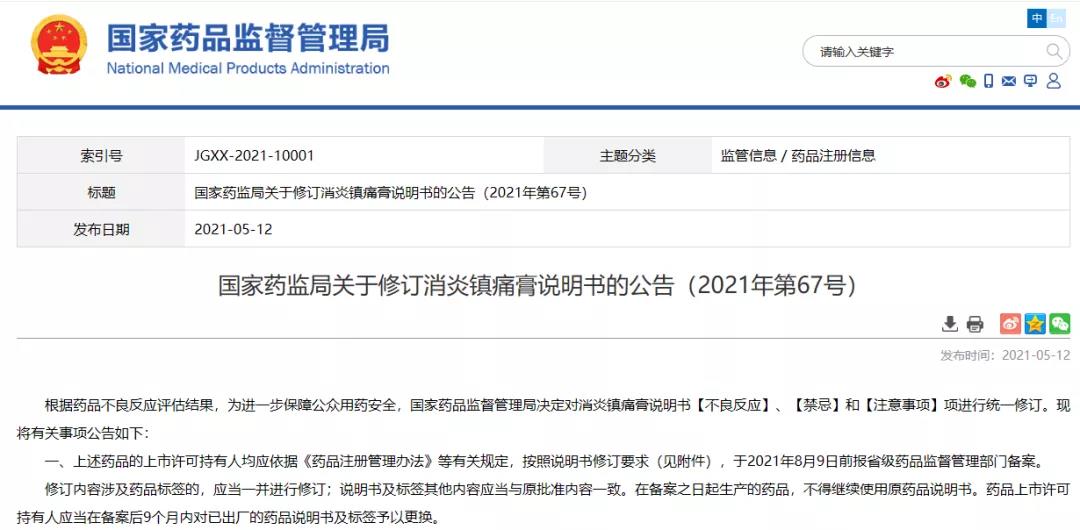 國家藥監(jiān)局關(guān)于修訂消炎鎮(zhèn)痛膏說明書的公告(2021年第67號(hào))