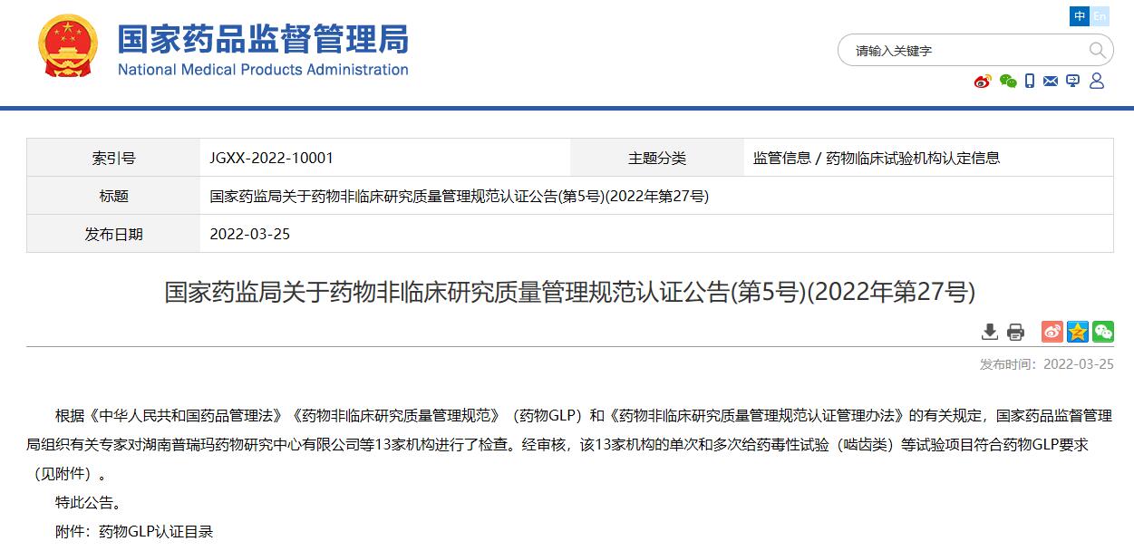國(guó)家藥監(jiān)局關(guān)于藥物非臨床研究質(zhì)量管理規(guī)范認(rèn)證公告(第5號(hào))(2022年第27號(hào))