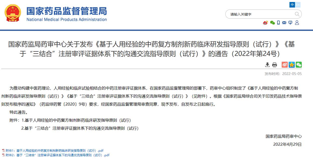 國家藥品監(jiān)督管理局為推動構(gòu)建中醫(yī)藥理論、人用經(jīng)驗和臨床試驗相結(jié)合的中藥注冊審評證據(jù)體系,在國家藥品監(jiān)督管理局的部署下,藥審中心組織制定了《基于人用經(jīng)驗的中藥復(fù)方制劑新藥臨床研發(fā)指導(dǎo)原則(試行)》《基于“三結(jié)合”注冊審評證據(jù)體系下的溝通交流指導(dǎo)原則(試行)》。