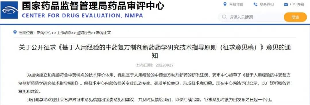 關(guān)于公開征求《基于人用經(jīng)驗(yàn)的中藥復(fù)方制劑新藥藥學(xué)研究技術(shù)指導(dǎo)原則(征求意見稿)》意見的通知