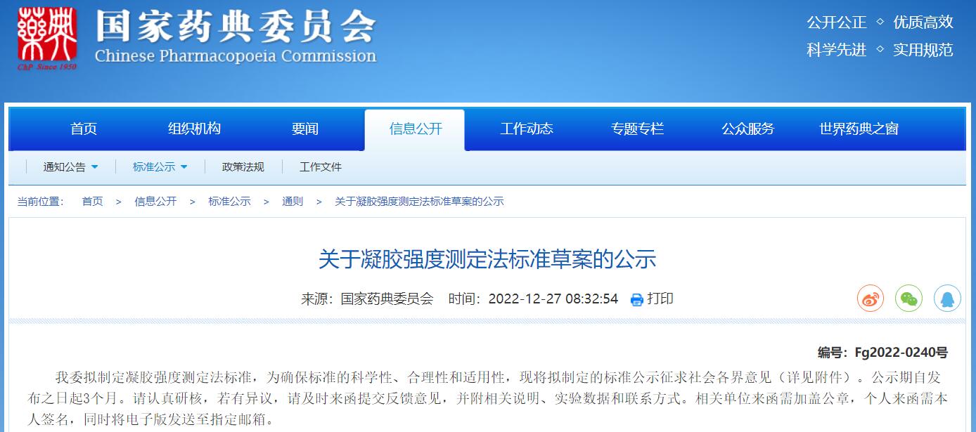 國家藥典委發(fā)布凝膠強(qiáng)度測定法標(biāo)準(zhǔn)草案的公示。