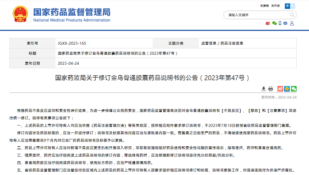 國家藥監(jiān)局關于修訂金烏骨通膠囊藥品說明書的公告(2023年第47號)