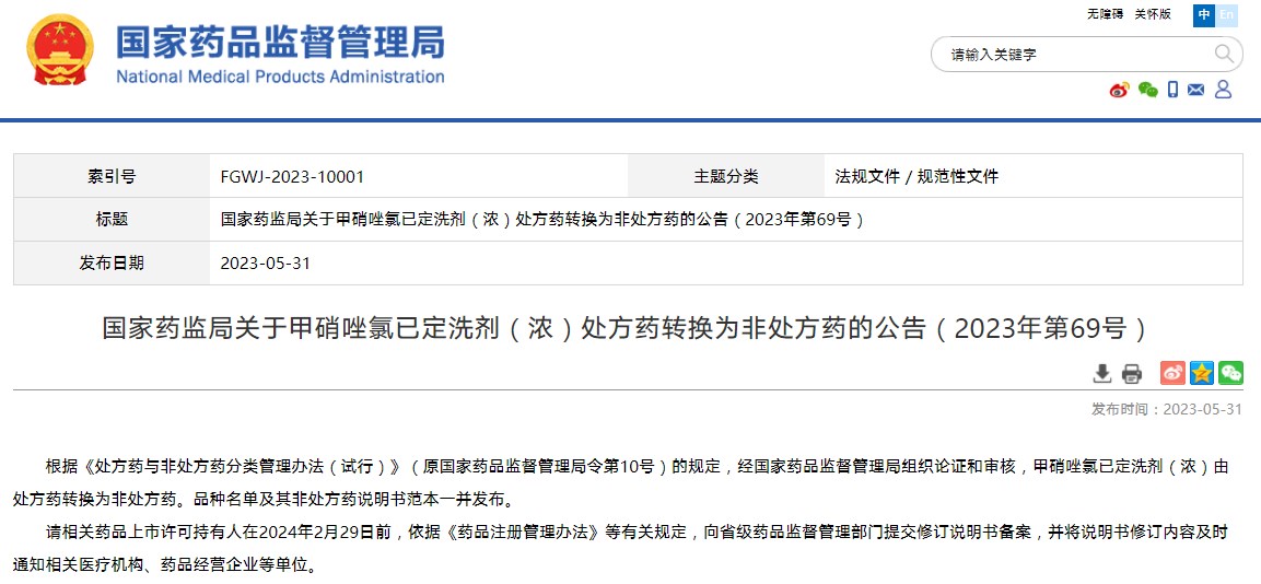 國家藥監(jiān)局關于甲硝唑氯已定洗劑(濃)處方藥轉(zhuǎn)換為非處方藥的公告(2023年第69號)