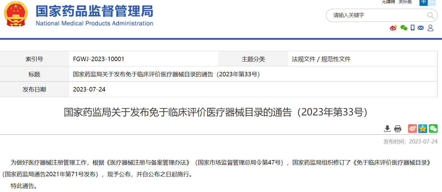 國家藥監(jiān)局關(guān)于發(fā)布免于臨床評價(jià)醫(yī)療器械目錄的通告(2023年第33號)