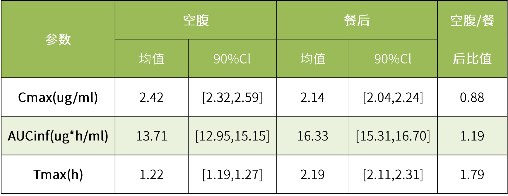 虛擬BE模擬結(jié)果表明,食物對(duì)克拉霉素生物利用度無(wú)顯著影響??死顾仄诳崭购筒秃鬆顟B(tài)下的平均血漿濃度-時(shí)間曲線(xiàn)均落在90%置信區(qū)間內(nèi)。虛擬人群試驗(yàn)表明,食物不會(huì)顯著改變克拉霉素片的Cmax和AUC,空腹與餐后的Cmax和AUC的90%置信區(qū)間均在生物等效性限值內(nèi)。