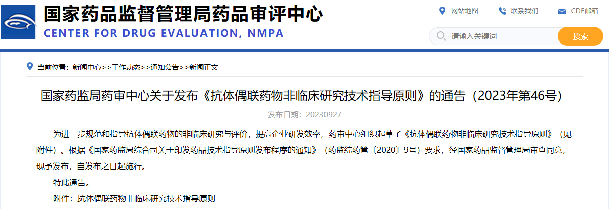 國家藥監(jiān)局藥審中心關(guān)于發(fā)布《抗體偶聯(lián)藥物非臨床研究技術(shù)指導(dǎo)原則》的通告(2023年第46號(hào))