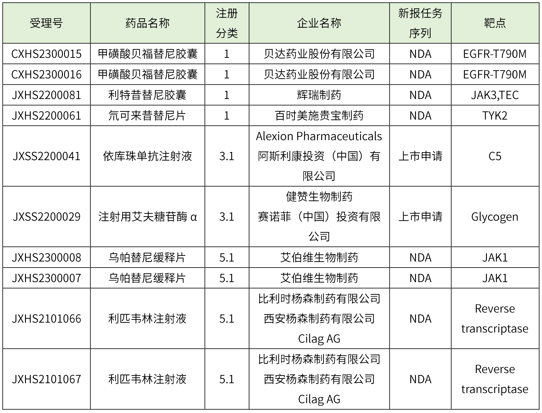 化學(xué)藥品1類3個(甲磺酸貝福替尼膠囊、利特昔替尼膠囊、氘可來昔替尼片),5.1類2個(烏帕替尼緩釋片、利匹韋林注射液),藥物詳細(xì)信息見下表。