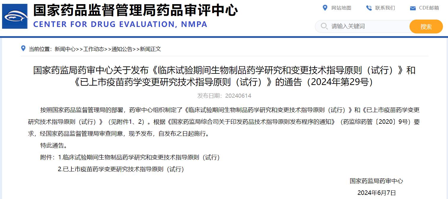 國家藥監(jiān)局藥審中心關(guān)于發(fā)布《臨床試驗(yàn)期間生物制品藥學(xué)研究和變更技術(shù)指導(dǎo)原則(試行)》和《已上市疫苗藥學(xué)變更研究技術(shù)指導(dǎo)原則(試行)》的通告(2024年第29號)