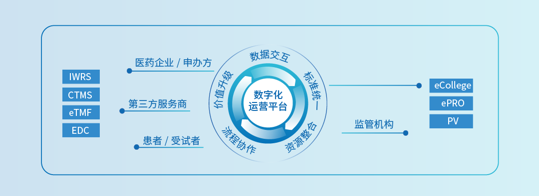 數(shù)字化運(yùn)營平臺(tái),全方位數(shù)字驅(qū)動(dòng)。 憑借專業(yè)數(shù)字化軟件、協(xié)作平臺(tái)和專業(yè)服務(wù)能力,鏈接醫(yī)院、制藥企業(yè)、服務(wù)商、監(jiān)管機(jī)構(gòu)、患者等行業(yè)參與者,實(shí)現(xiàn)各環(huán)節(jié)全方位數(shù)據(jù)驅(qū)動(dòng),致力于用創(chuàng)新的服務(wù)模式和多維的信息化技術(shù)推動(dòng)臨床研究的發(fā)展。