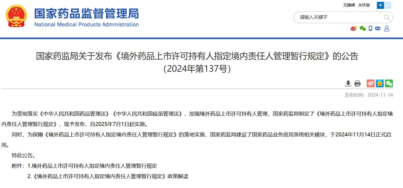 國家藥監(jiān)局關(guān)于發(fā)布《境外藥品上市許可持有人指定境內(nèi)責(zé)任人管理暫行規(guī)定》的公告(2024年第137號)