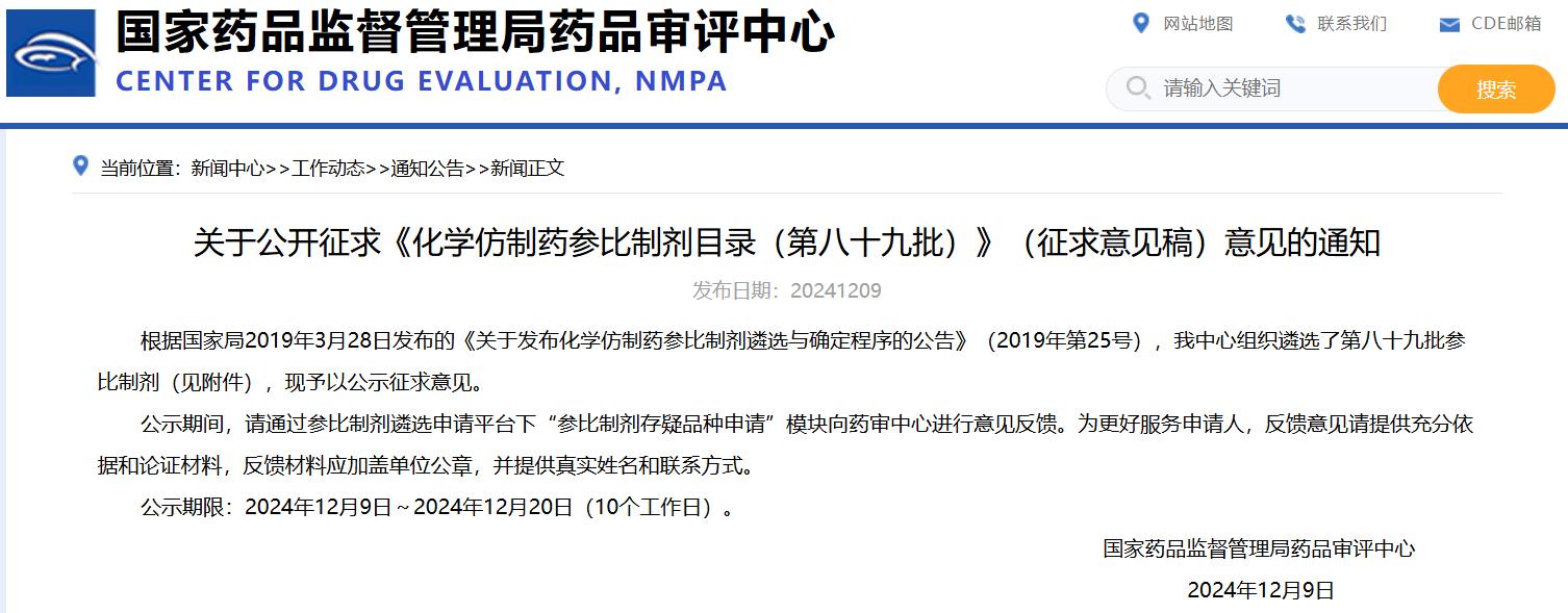關(guān)于公開征求《化學(xué)仿制藥參比制劑目錄(第八十九批)》(征求意見稿)意見的通知