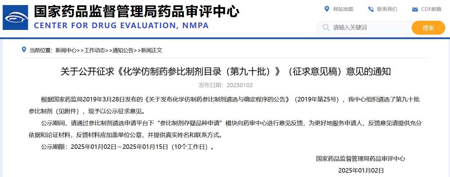關(guān)于公開征求《化學仿制藥參比制劑目錄(第九十批)》(征求意見稿)意見的通知