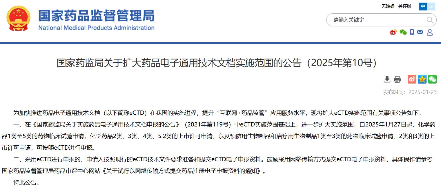 國家藥監(jiān)局關于擴大藥品電子通用技術文檔實施范圍的公告(2025年第10號)