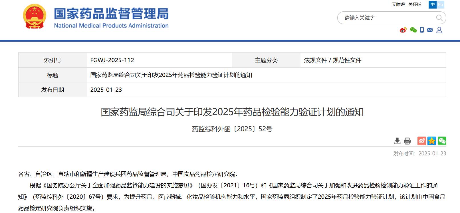國家藥監(jiān)局綜合司關于印發(fā)2025年藥品檢驗能力驗證計劃的通知