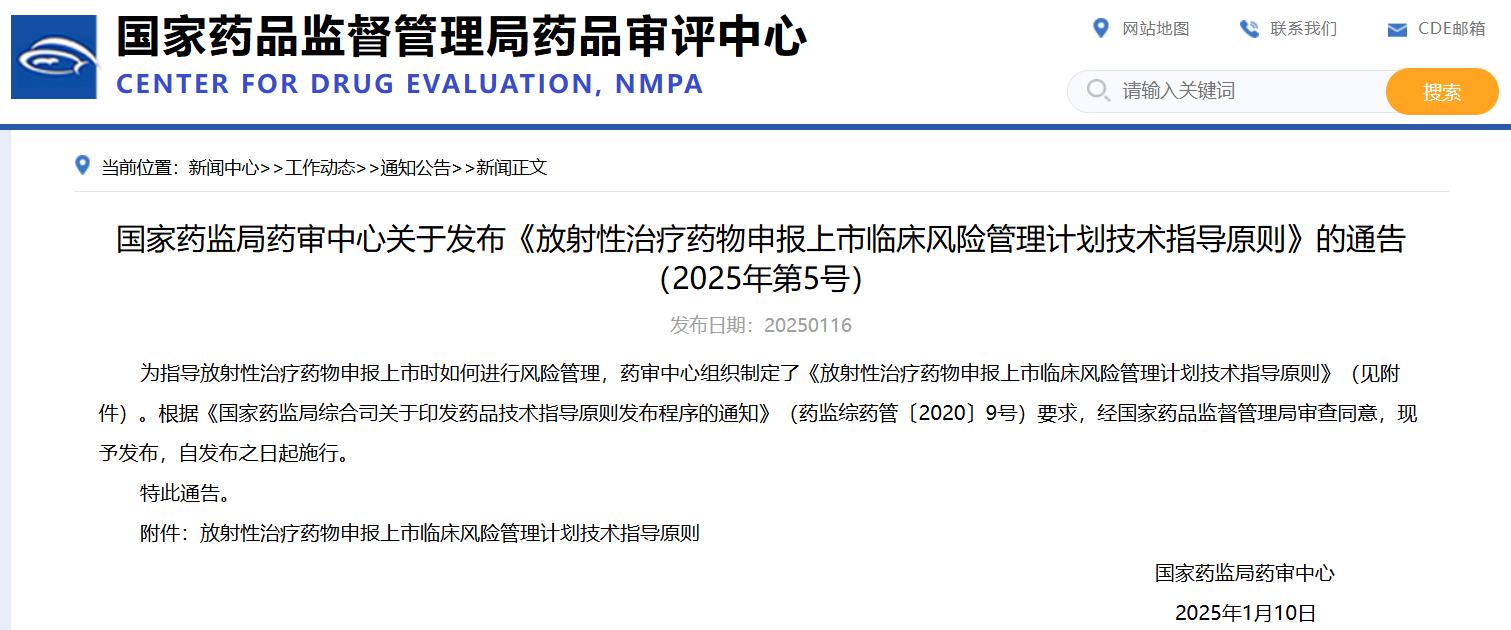 國家藥監(jiān)局藥審中心關于發(fā)布《放射性治療藥物申報上市臨床風險管理計劃技術指導原則》的通告(2025年第5號)