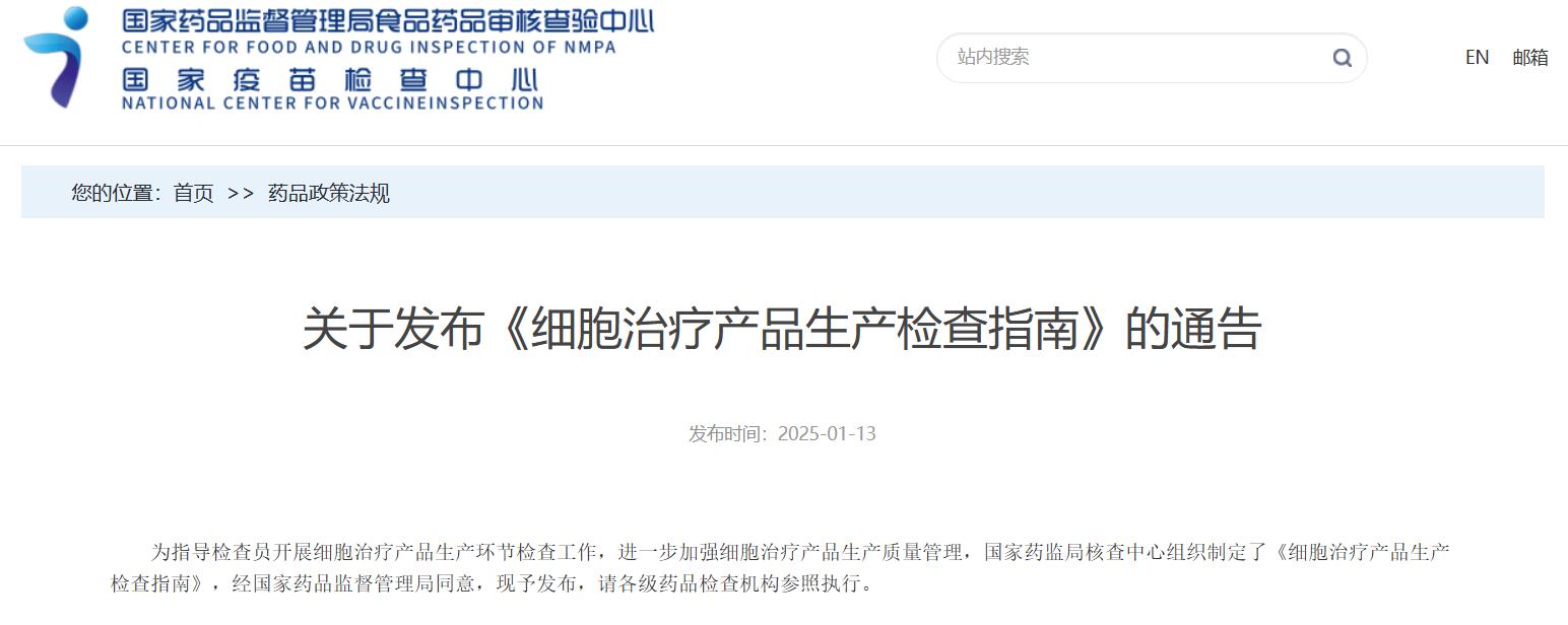 國家藥監(jiān)局核查中心關于發(fā)布《細胞治療產(chǎn)品生產(chǎn)檢查指南》的通告