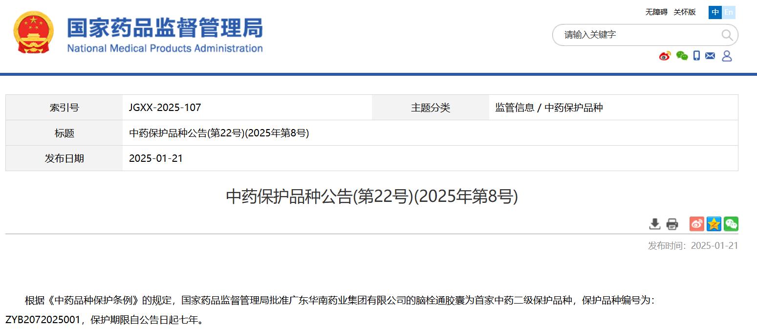 國家藥監(jiān)局關于中藥保護品種的公告(延長保護期第20號)(2025年第9號)