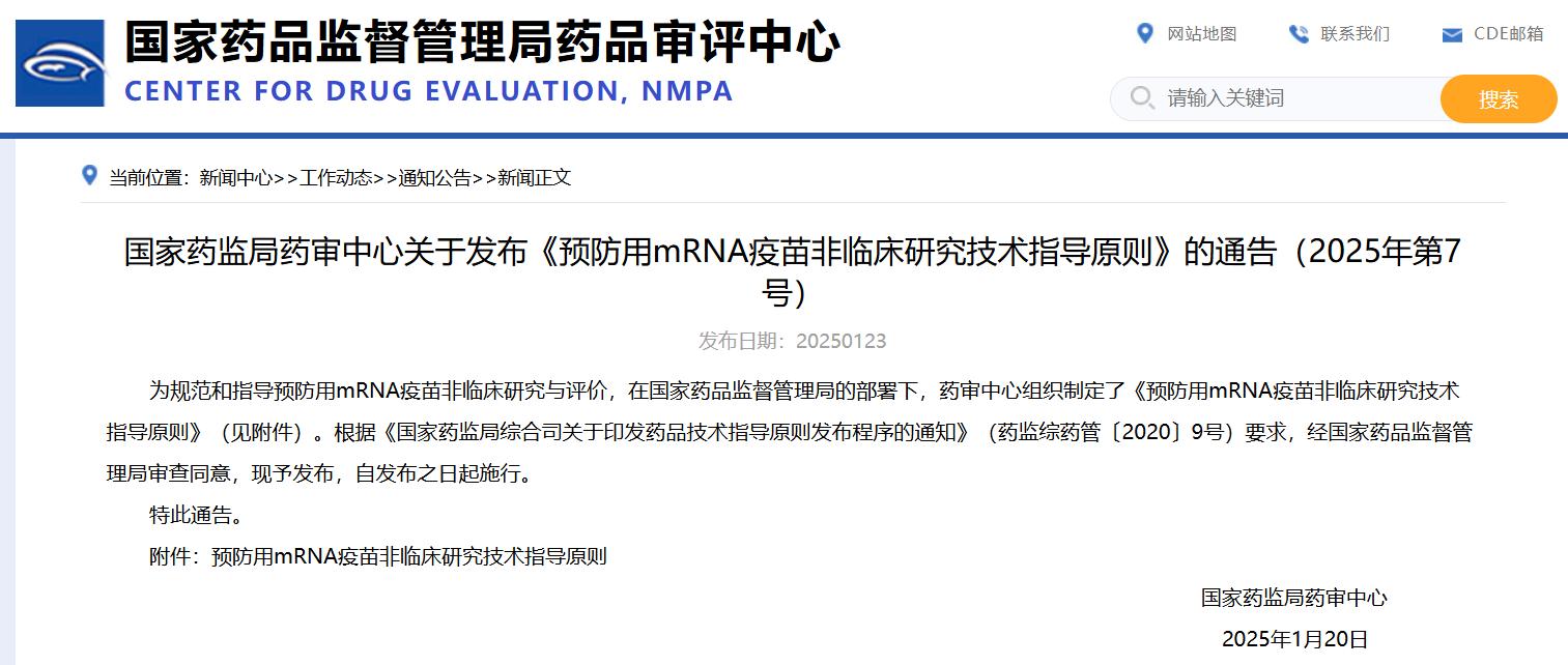 國家藥監(jiān)局藥審中心關于發(fā)布《預防用mRNA疫苗非臨床研究技術指導原則》的通告(2025年第7號)