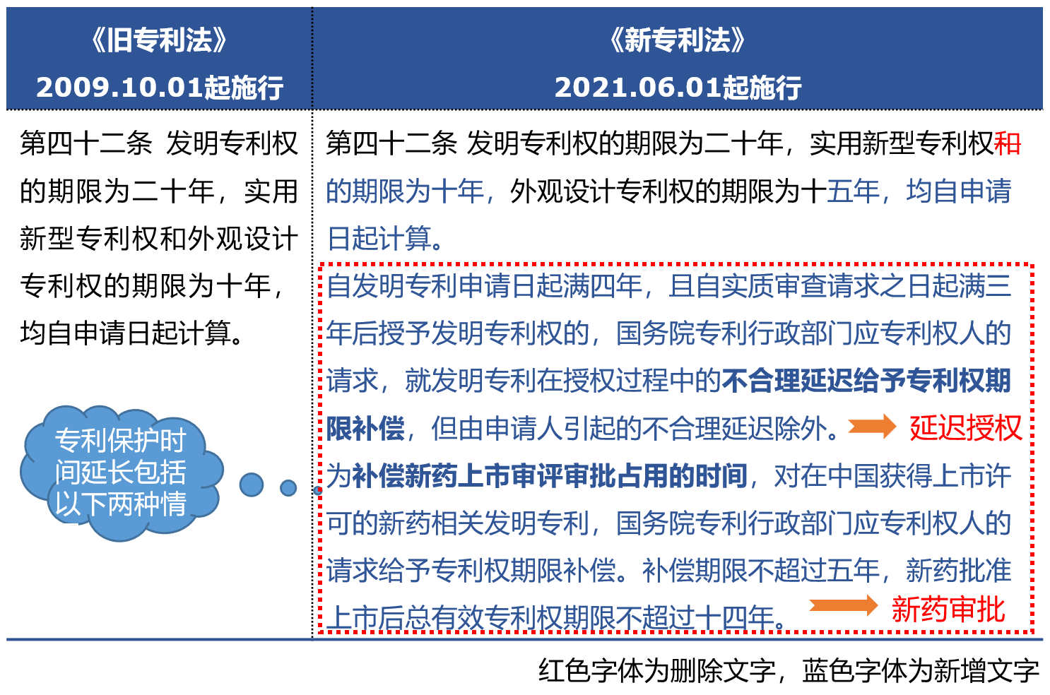 第三款中規(guī)定,為補償新藥上市審評審批占用的時間,對在中國獲得上市許可的新藥相關發(fā)明專利,國務院專利行政部門應專利權(quán)人的請求給予專利權(quán)期限補償。補償期限不超過五年,新藥批準上市后總有效專利權(quán)期限不超過十四年。