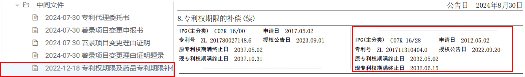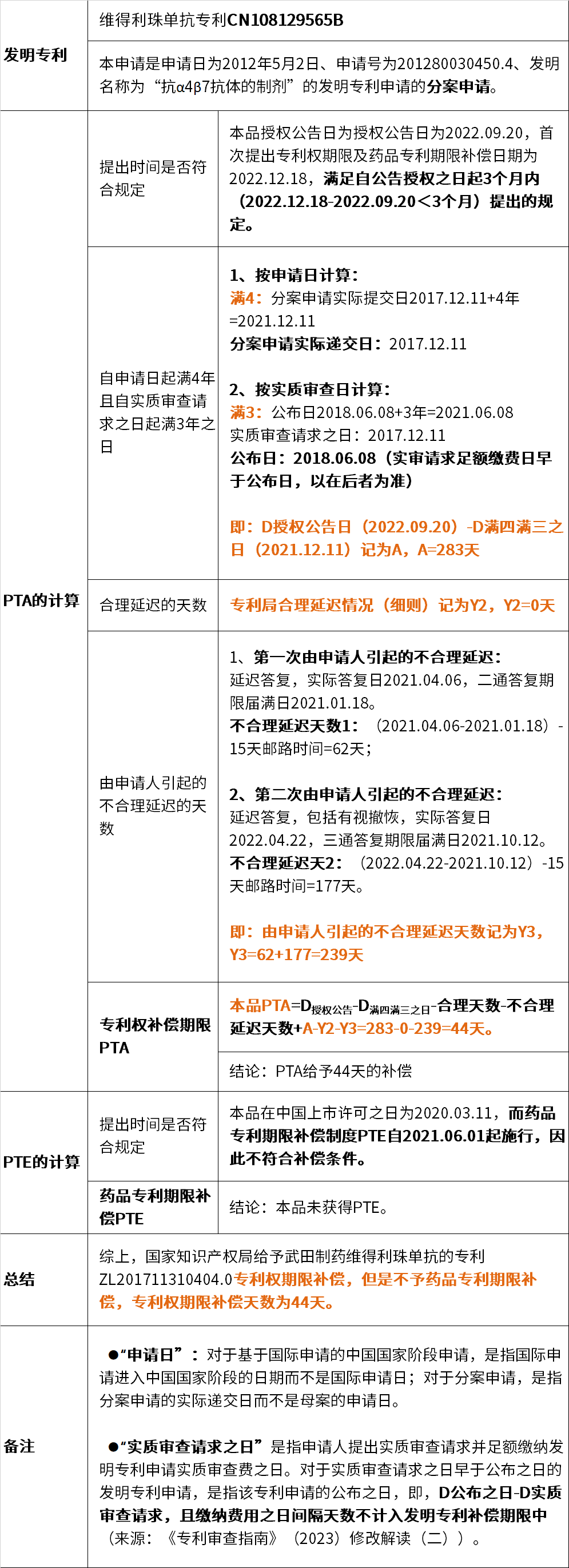 下面通過案例來更深入了解專利權(quán)期限補償,維得利珠單抗專利為國內(nèi)首批獲得專利權(quán)期限補償審批的發(fā)明專利,但未獲得藥品專利期限補償。