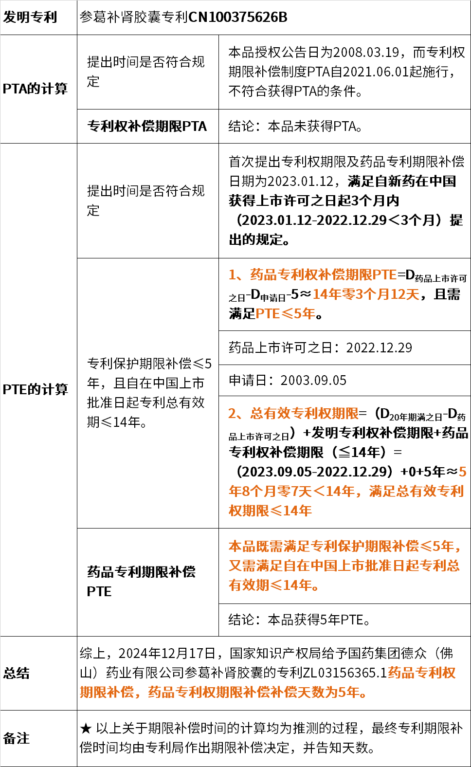 ● 美國:PTE=臨床研究時間的1/2+注冊審批時間;整個專利期限恢復≤5年,并且在FDA批準NDA后,剩余的專利期限≤14年。