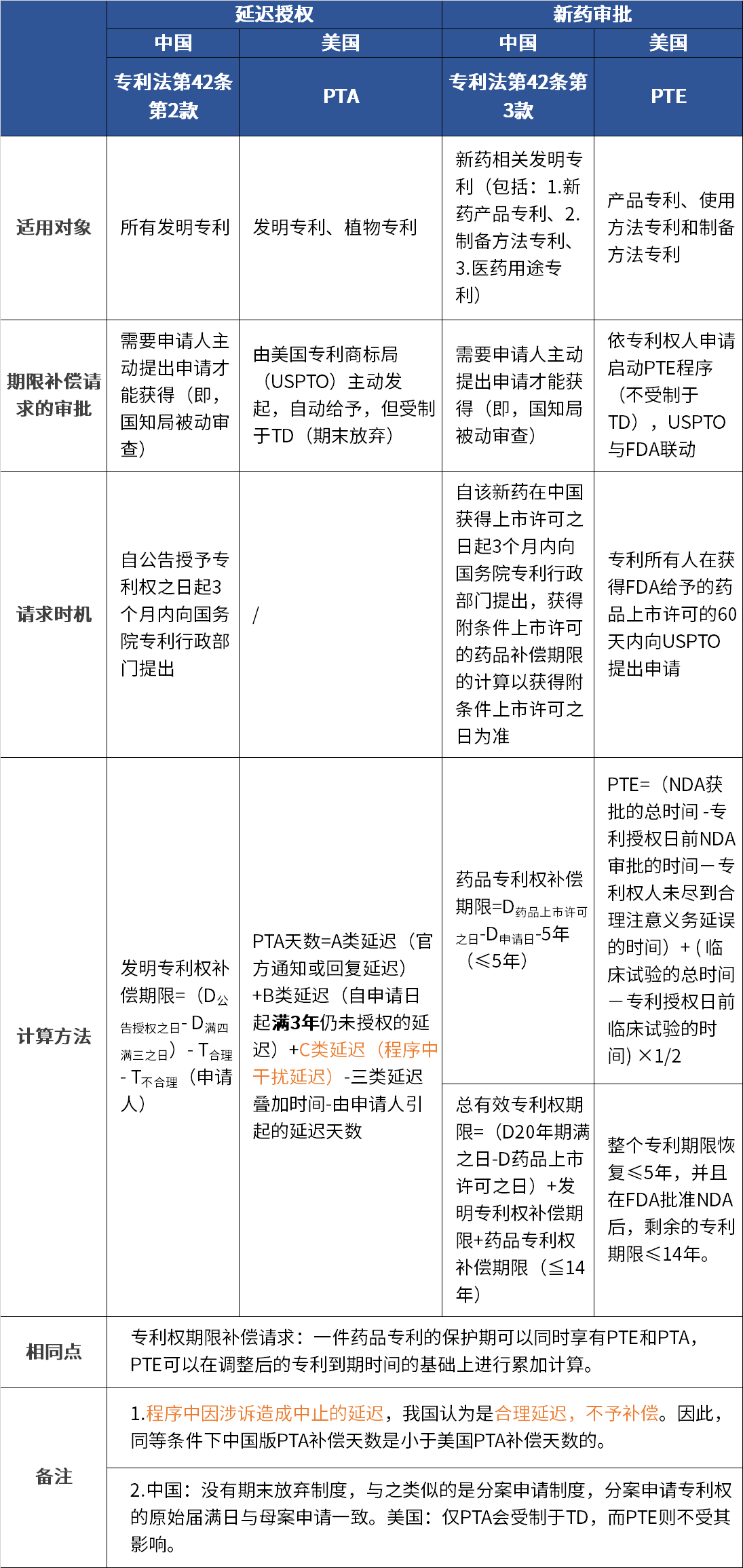 為了更直觀對比專利權(quán)期限補償(PTA)和藥品專利權(quán)期限補償(PTE)的區(qū)別,列出如下表格: