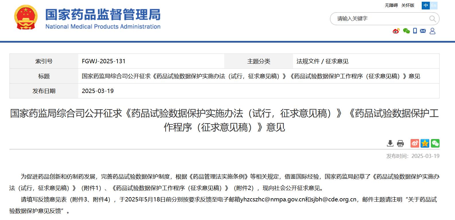 國家藥監(jiān)局綜合司公開征求《藥品試驗(yàn)數(shù)據(jù)保護(hù)實(shí)施辦法(試行,征求意見稿)》《藥品試驗(yàn)數(shù)據(jù)保護(hù)工作程序(征求意見稿)》意見
