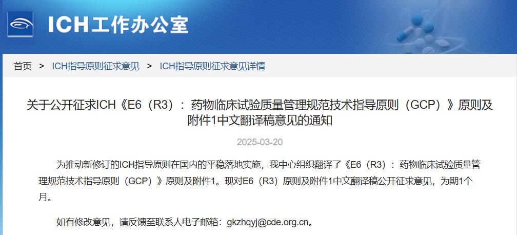 關(guān)于公開征求ICH《E6(R3):藥物臨床試驗(yàn)質(zhì)量管理規(guī)范技術(shù)指導(dǎo)原則(GCP)》原則及附件1中文翻譯稿意見的通知