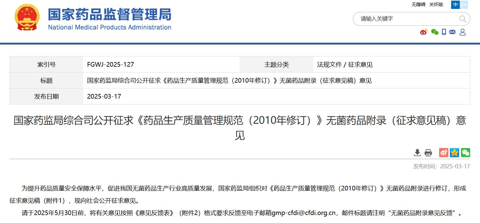 國家藥監(jiān)局綜合司公開征求《藥品生產(chǎn)質(zhì)量管理規(guī)范(2010年修訂)》無菌藥品附錄(征求意見稿)意見