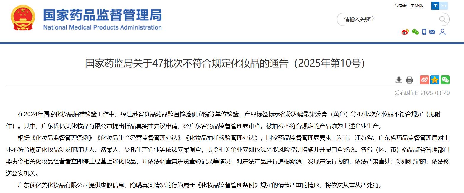 國家藥監(jiān)局關(guān)于47批次不符合規(guī)定化妝品的通告(2025年第10號)
