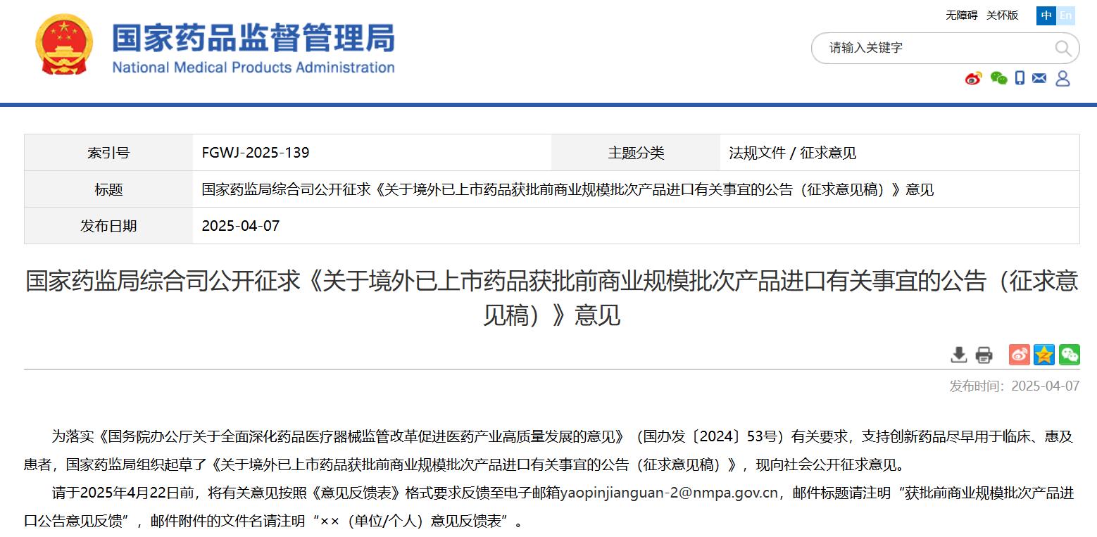 政策法規(guī) || 《關(guān)于境外已上市藥品獲批前商業(yè)規(guī)模批次產(chǎn)品進(jìn)口有關(guān)事宜的公告(征求意見稿)》(附法規(guī)概覽4.7-4.18)