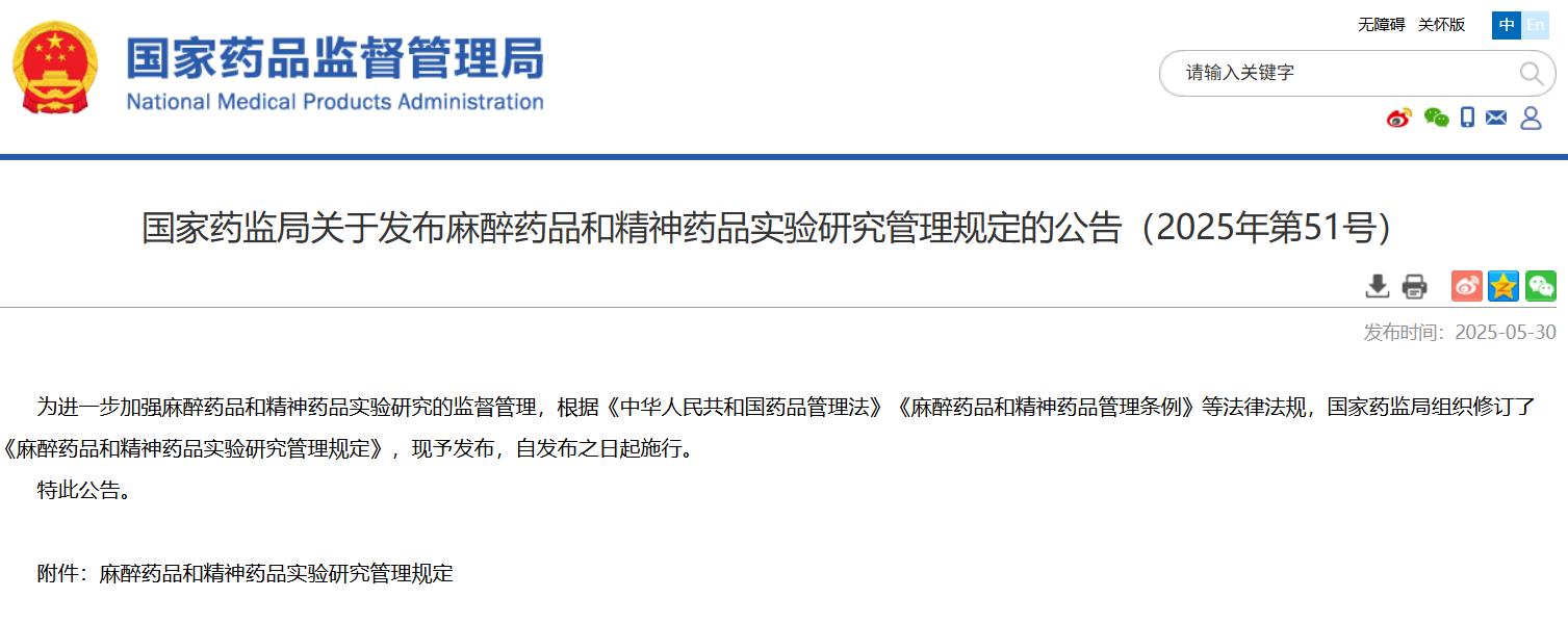 國家藥監(jiān)局關于發(fā)布麻醉藥品和精神藥品實驗研究管理規(guī)定的公告(2025年第51號)