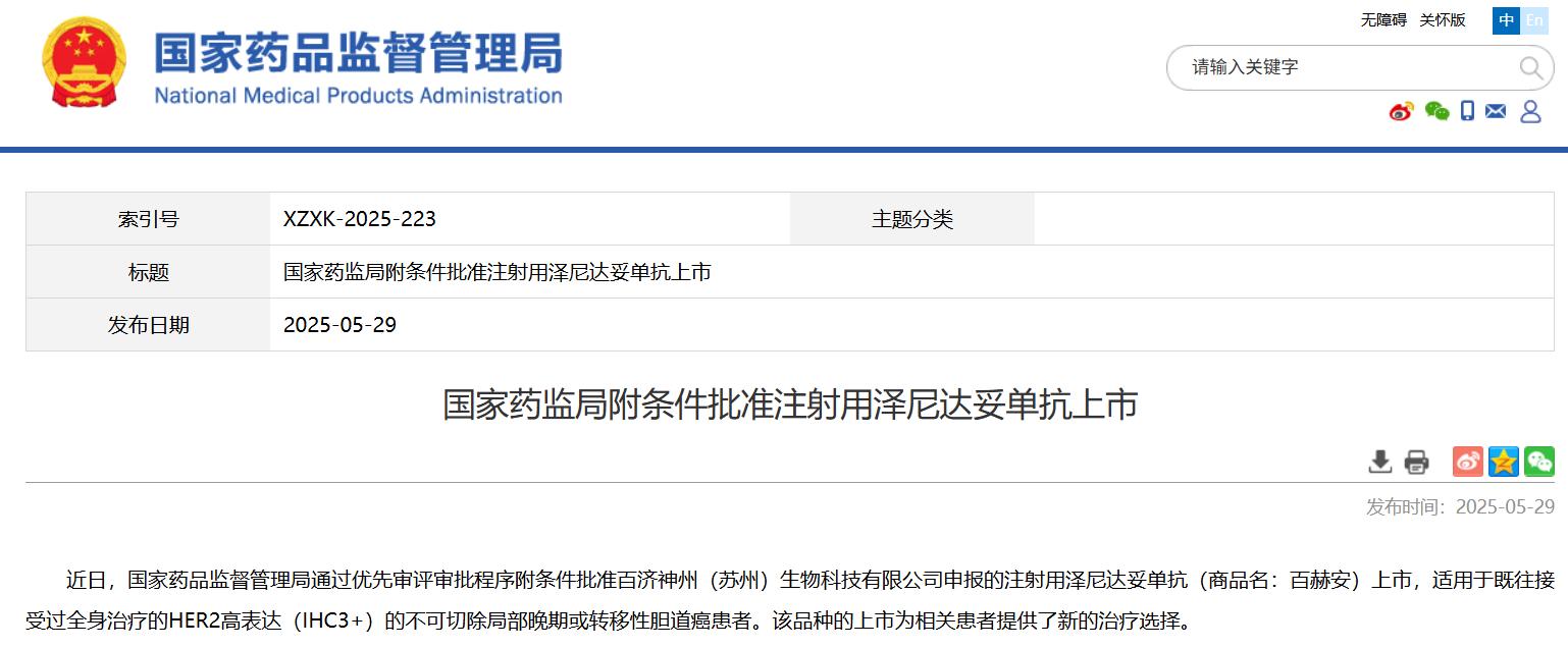 國家藥監(jiān)局附條件批準注射用澤尼達妥單抗上市