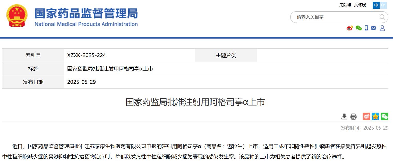國家藥監(jiān)局批準注射用阿格司亭α上市