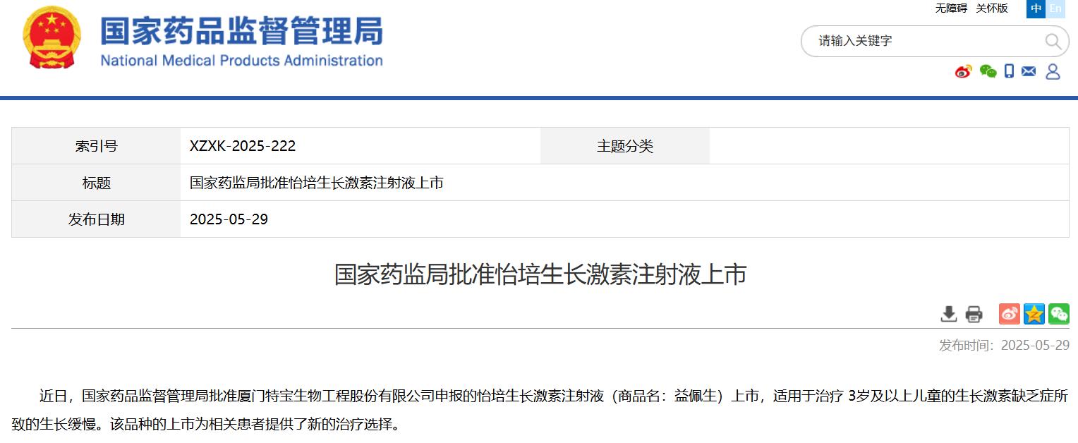 國家藥監(jiān)局批準怡培生長激素注射液上市