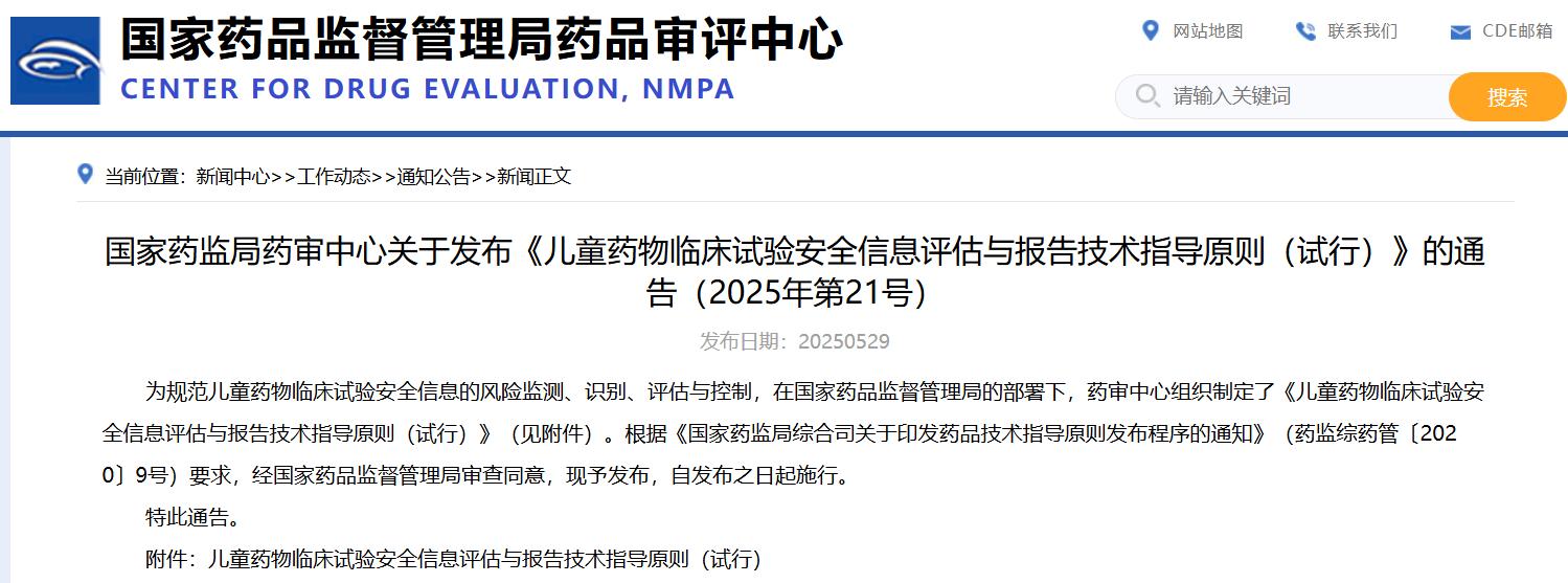 國家藥監(jiān)局藥審中心關于發(fā)布《兒童藥物臨床試驗安全信息評估與報告技術指導原則(試行)》的通告(2025年第21號)