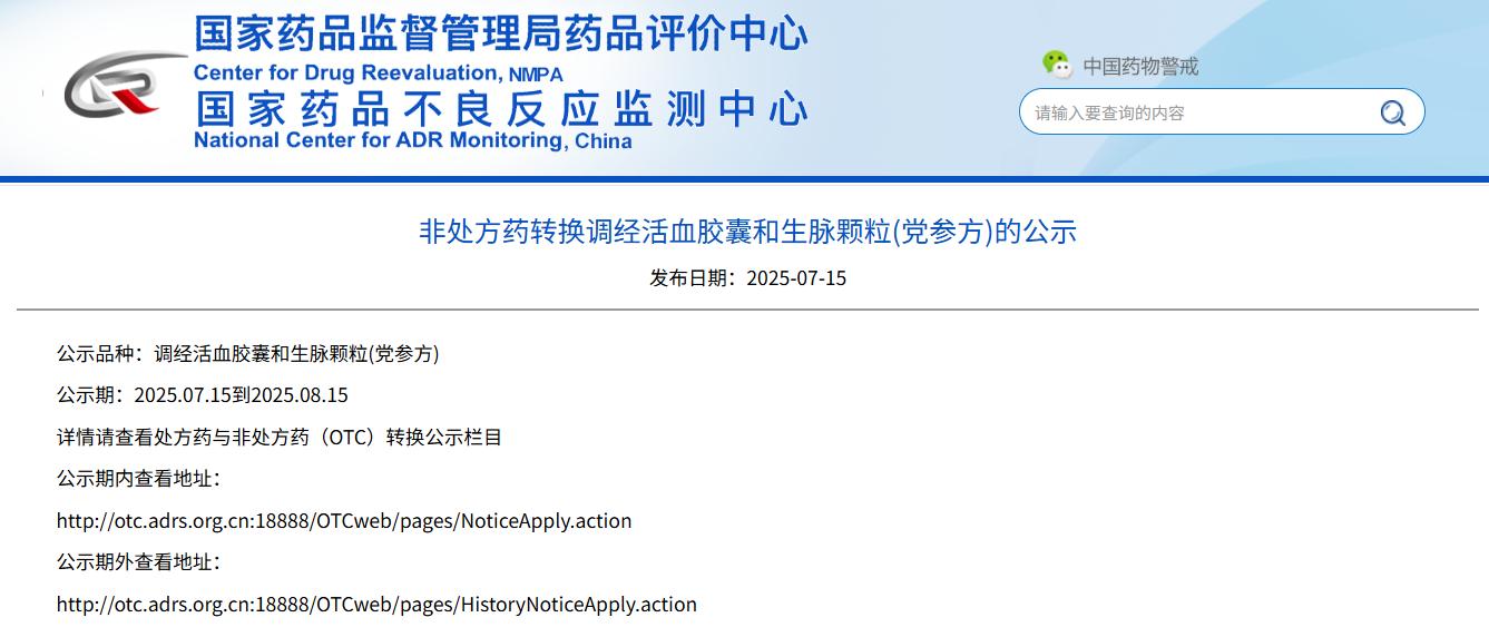 非處方藥轉(zhuǎn)換調(diào)經(jīng)活血膠囊和生脈顆粒(黨參方)的公示