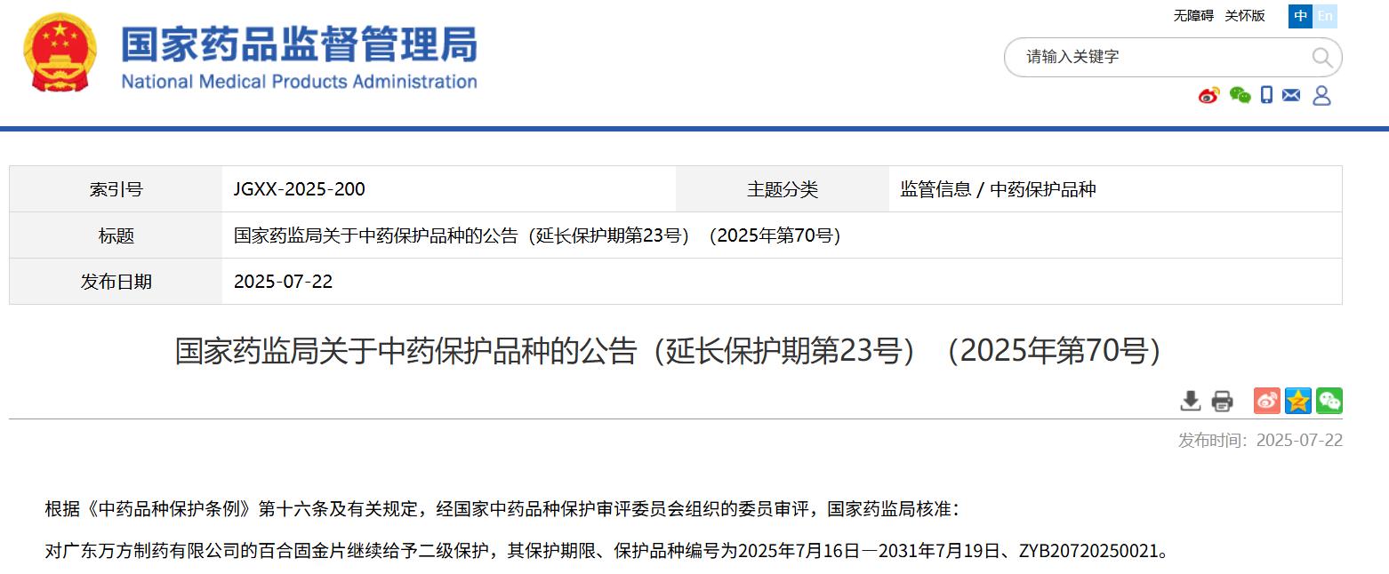 國(guó)家藥監(jiān)局關(guān)于中藥保護(hù)品種的公告(延長(zhǎng)保護(hù)期第23號(hào))(2025年第70號(hào))