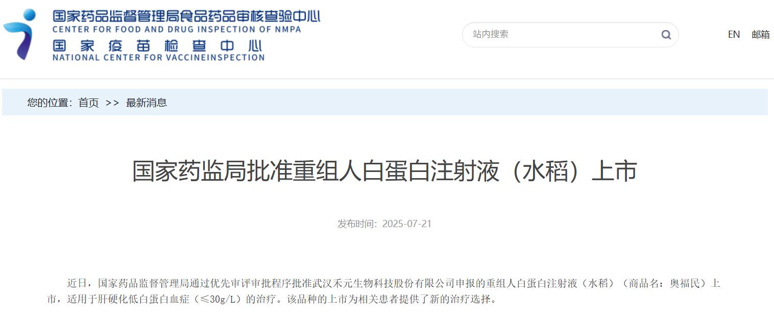 國(guó)家藥監(jiān)局批準(zhǔn)重組人白蛋白注射液(水稻)上市