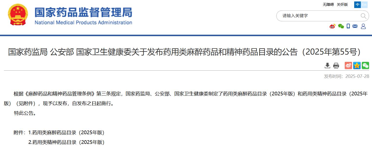 國(guó)家藥監(jiān)局 公安部 國(guó)家衛(wèi)生健康委關(guān)于發(fā)布藥用類麻醉藥品和精神藥品目錄的公告(2025年第55號(hào))
